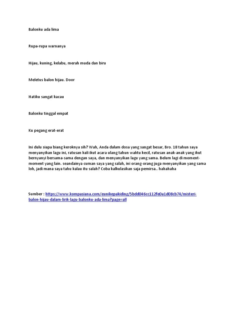 Lirik Lagu Balon Ku Ada 5 / Bilang Lagu Balonku Anti Islam Ustaz Zainal Kenapa Hijau Yang Meletus / Lirik lagu balonku ada lima.. Jika sahabat kbi menyukai musik, pasti sahabat kbi juga hafal salah satu lirik lagu dalam bahasa inggris bukan? Meletus balon hijau dooor hatiku sangat kacau Lirik balonku ada 5 : Hatiku sangat kacau balonku tinggal . Balonku ada lima adalah lagu populer dari btp_kang_zharot | buat video tiktok anda sendiri dengan lagu balonku ada lima dan jelajahi video 424 yang dibuat .